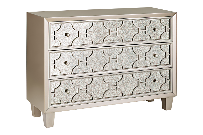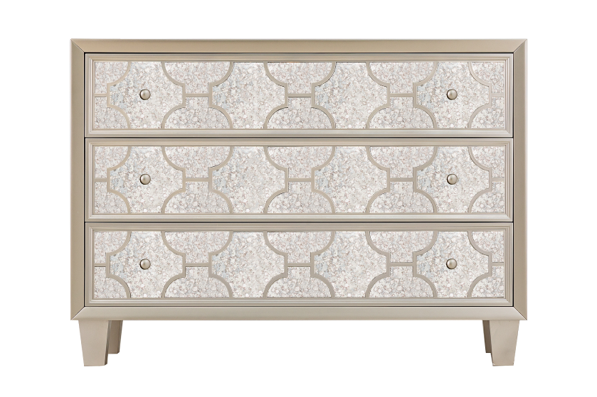 Комод изготовлен из высококачественных материалов. Корпус и фасады МДФ покрытые эмалью. Зеркальные декоративные вставки на фасадах. Наполнение комода из ламинированного ДСП, ящики с доводчиком. Опоры из массива бука.