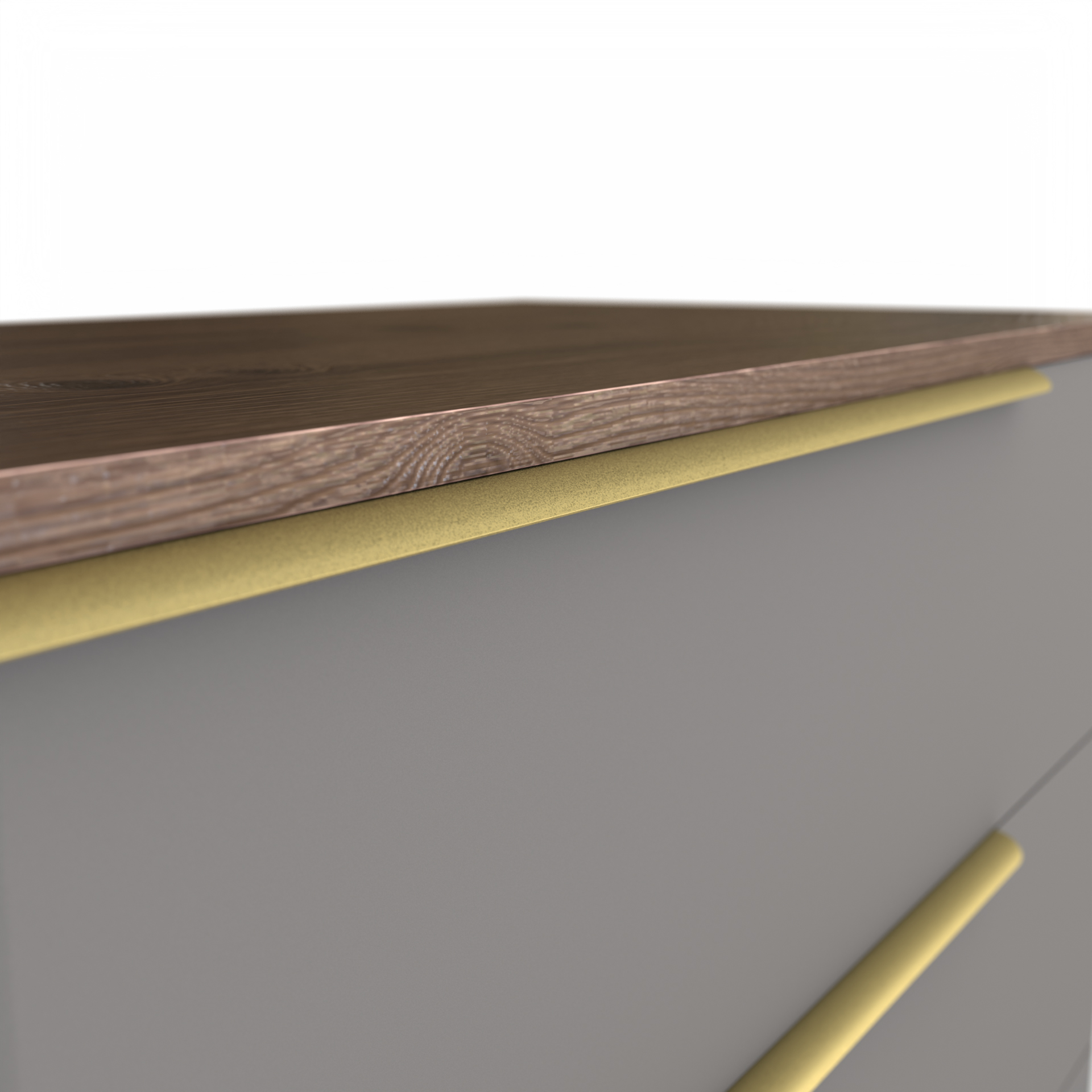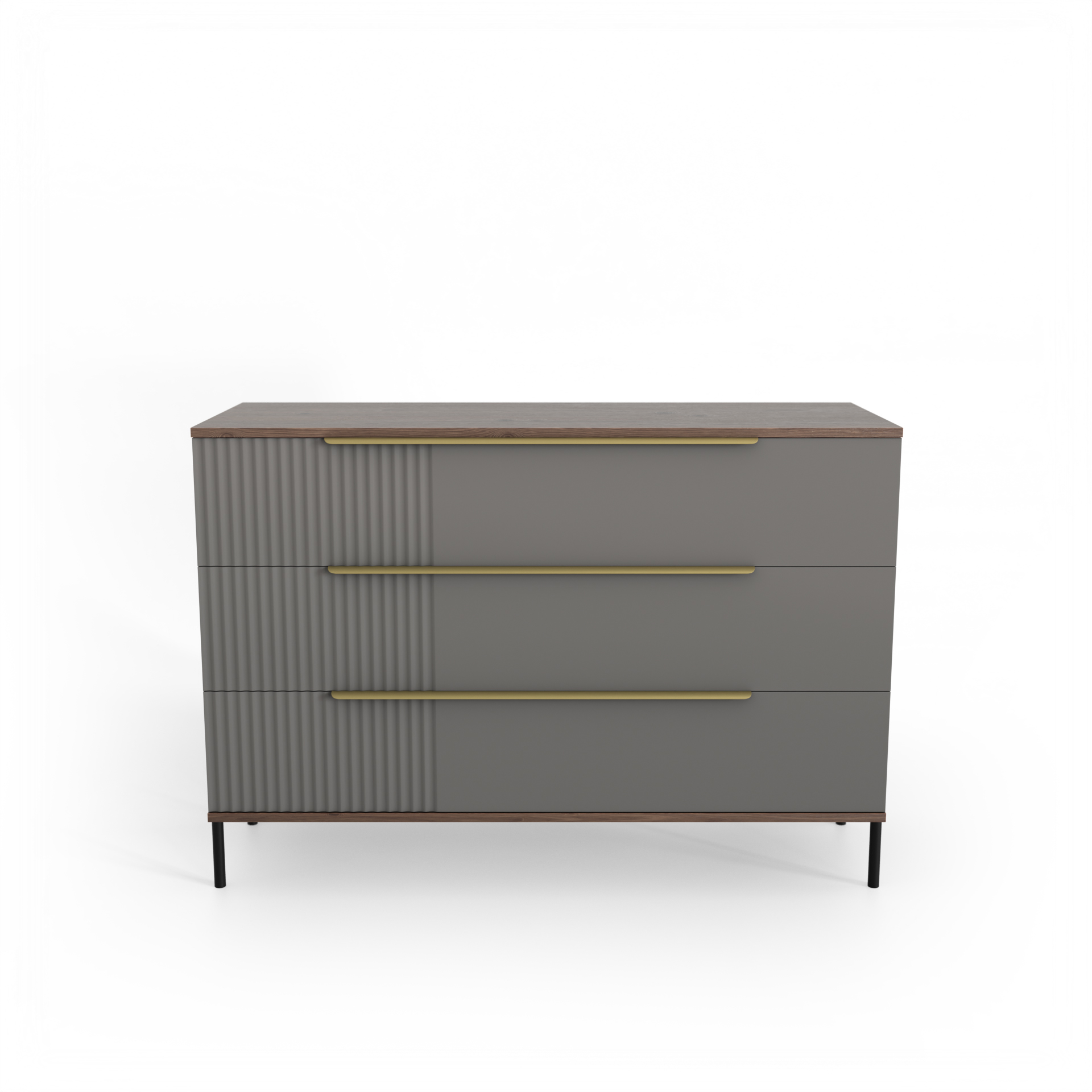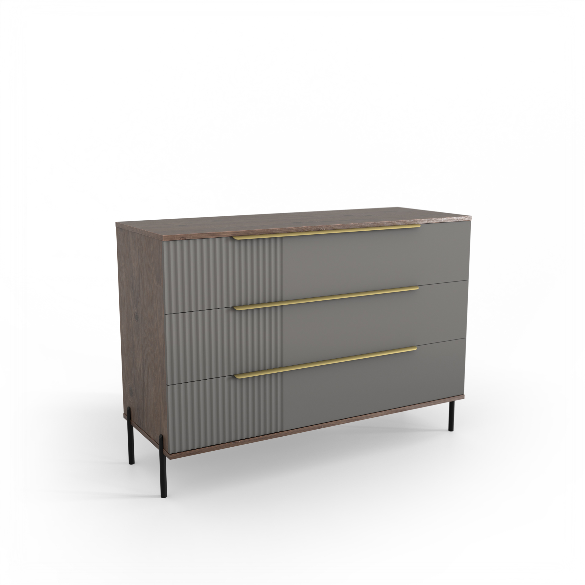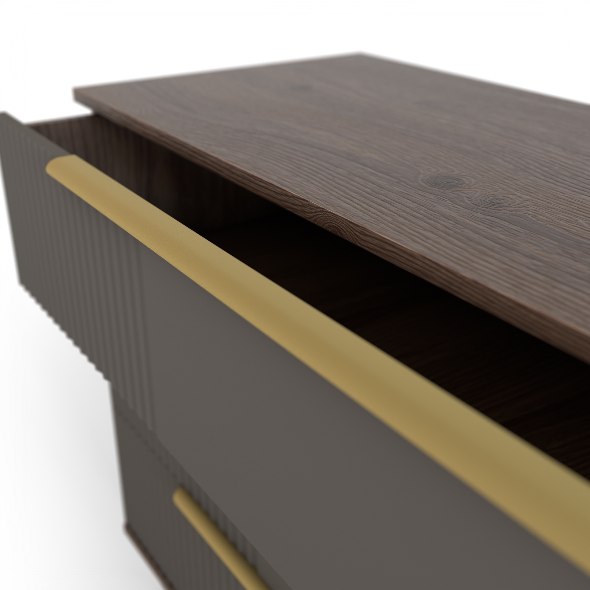 Неповторимый дизайн комода Комо притягивает взгляд и добавляет изысканности в интерьер. Главная изюминка – рифленый фасад нежного оливкового оттенка, который идеально сочетается с элегантными золотыми ручками.