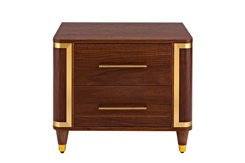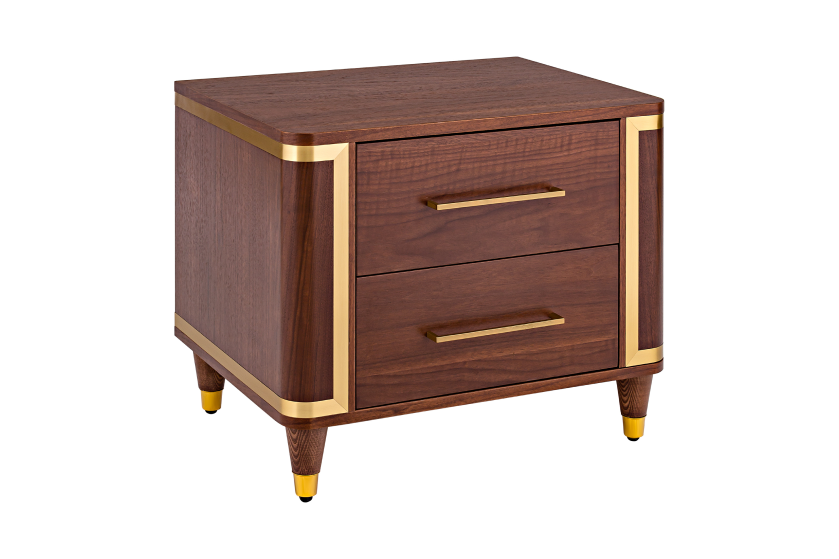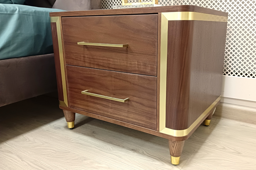 Тумба прикроватная Монтана обладает неповторимым дизайном и станет настоящим украшением интерьера. Корпус и фасады тумбы прикроватной изготовлены из МДФ со шпоном ореха. Ножки из массива натурального дерева. Декоративный элемент отделан металлизированным пластиком золотистого цвета. Направляющие шариковые с доводчиком.