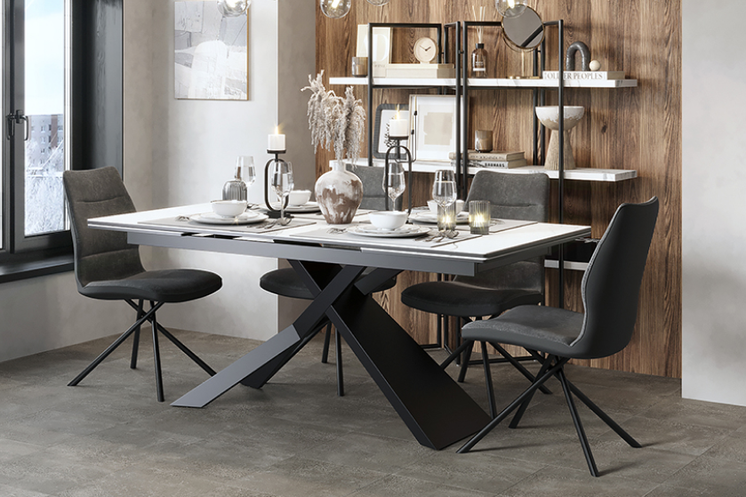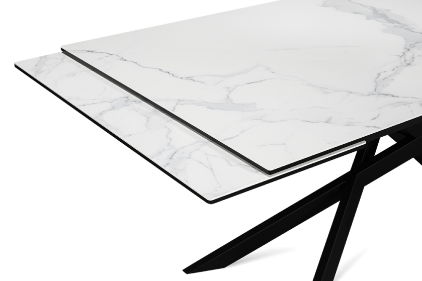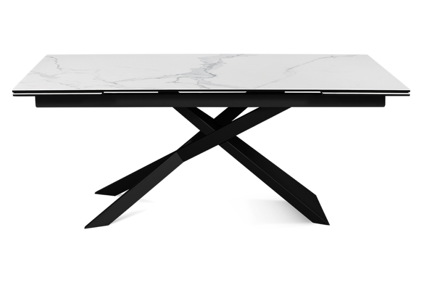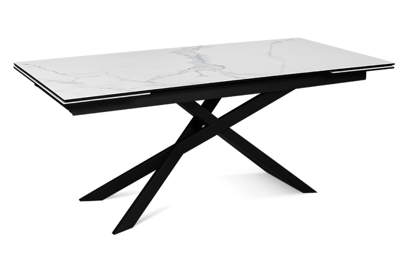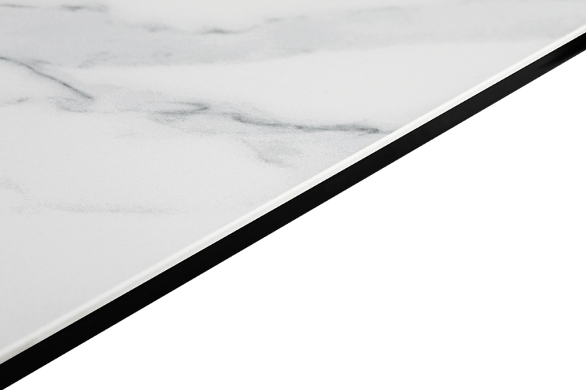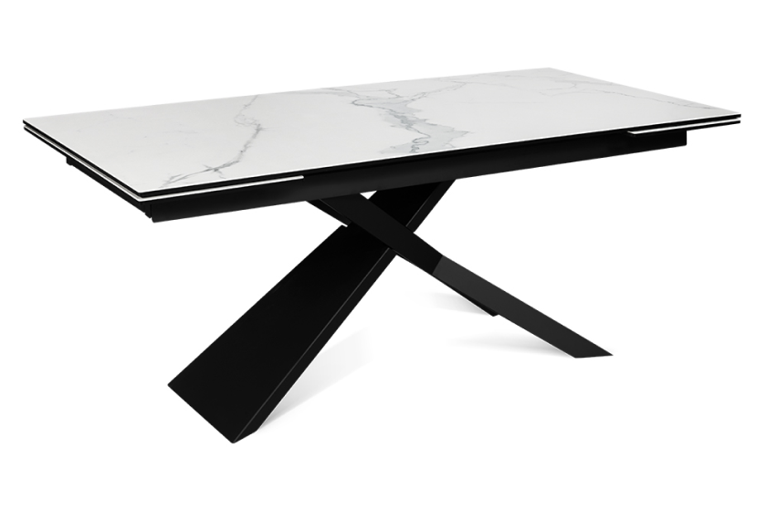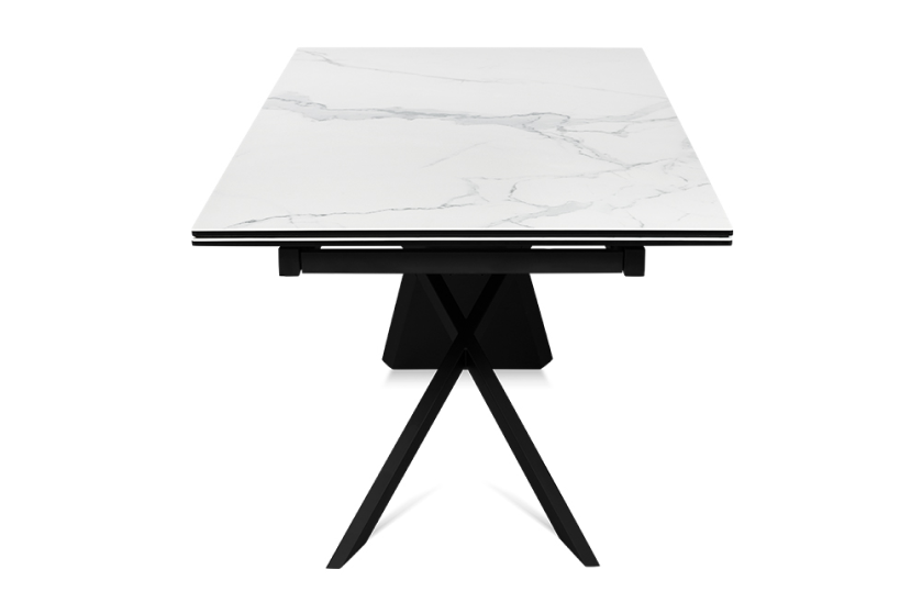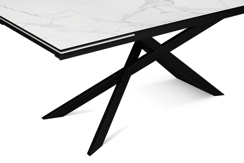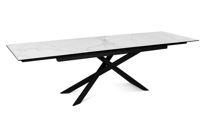 Стол оформлен в сочетании лофт-стиля и классических элементов, представляя собой современную интерпретацию. Его минималистичная поверхность изготовлена из керамики, которая напоминает белый мрамор Каррара. Уникальный рисунок максимально повторяет текстуру природного камня. В качестве опорной конструкции используется прочная нержавеющая сталь. Пользуясь автоматическим механизмом, длину стола можно без труда увеличить на 80 см.