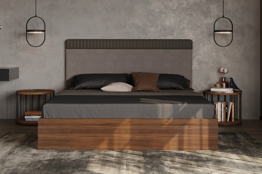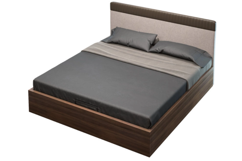 Кровать с актуальным дизайном из коллекции Menorca, представленной испанским брендом, оснащена ящиком для хранения, который делится на две части.