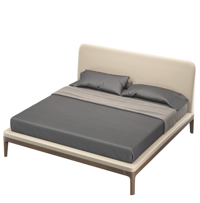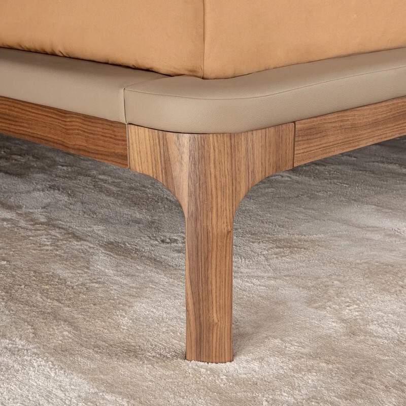 Изголовье кровати изготовлено из МДФ высокой плотности производства Новой Зеландии, что обеспечивает прочность и стабильность формы. Основание и ножки выполнены из массива дерева, гарантируя надежность конструкции и длительный срок службы. Отделка выполнена натуральным шпоном американского ореха, который придает мебели теплый благородный оттенок. Текстура ореха гармонично сочетается с нежным бежевым оттенком эко-кожи, используемой в отделке изголовья и базы кровати.
