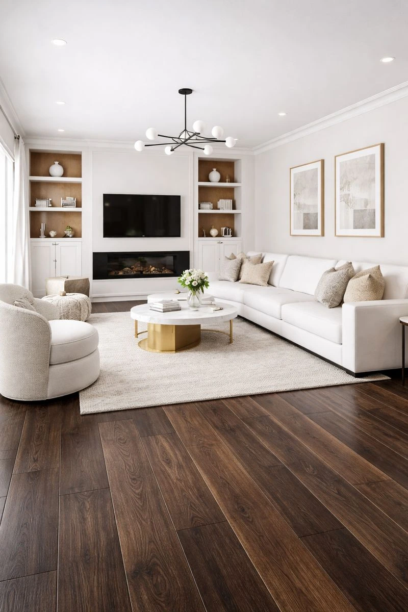 Пол - главный элемент, который задаёт теплоту интерьера с белой мебелью.