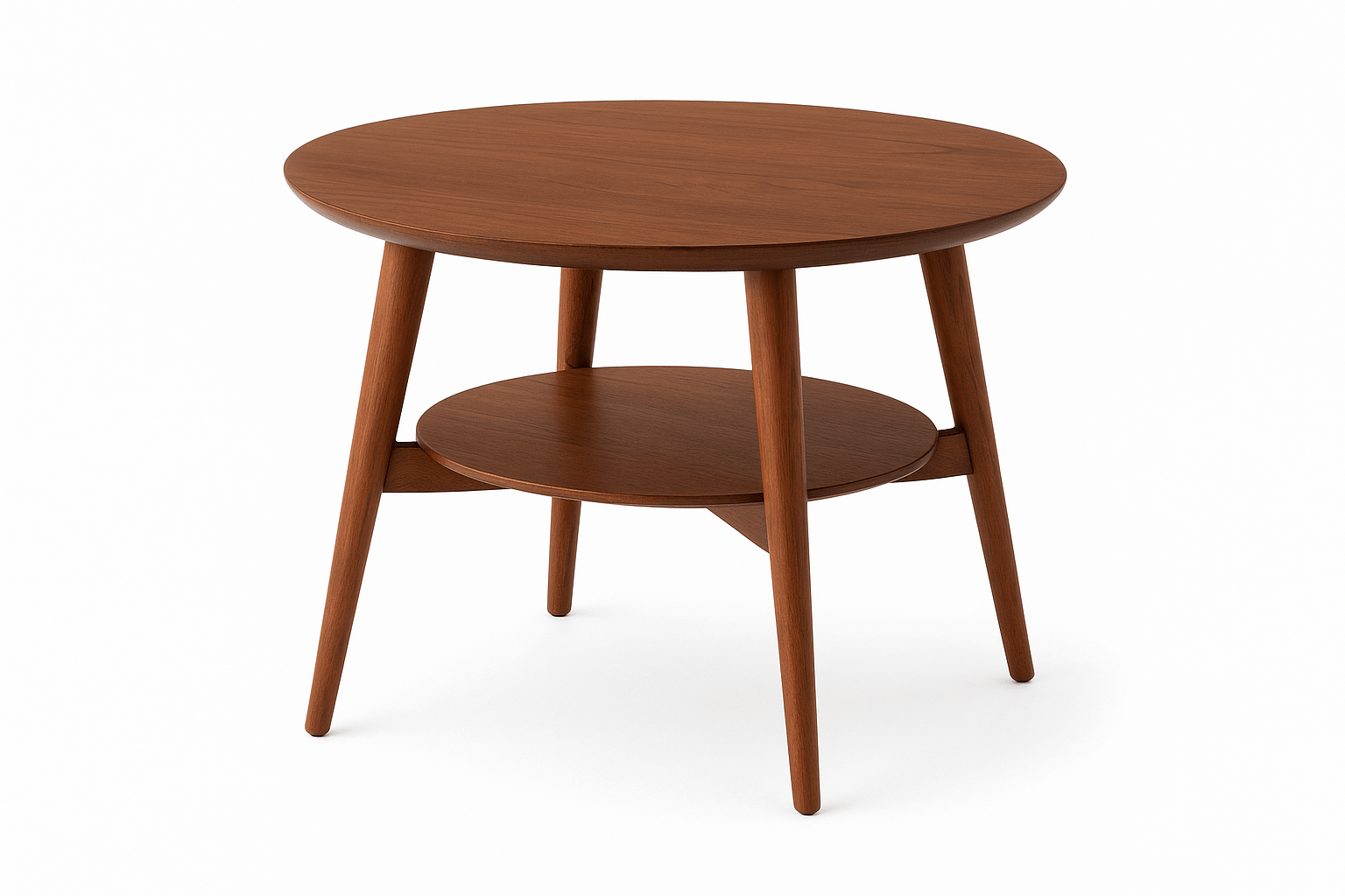 Журнальные столики mid-century часто имеют овальные или круглые столешницы, тонкие металлические или деревянные ножки и лёгкую конструкцию.