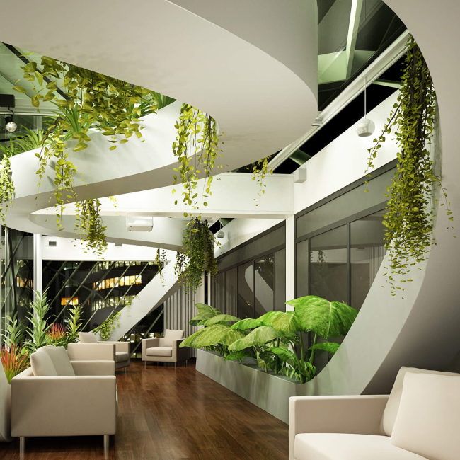 Этот тренд подчеркивает связь с окружающей средой, интегрируя в интерьер живые растения, натуральные материалы и естественное освещение.