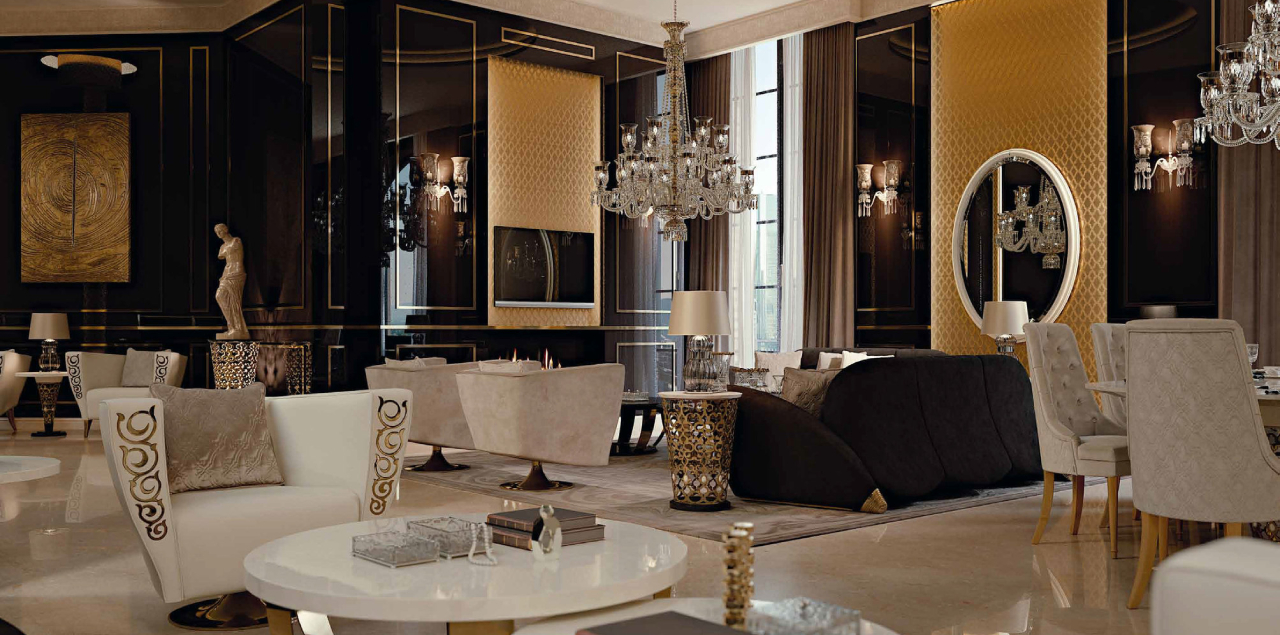 Мебель. Стулья, столы, шкафы и диваны с геометрическими деталями, для которых характерны дорогие материалы, такие как дерево, мрамор, стекло, металл и кожа. Зеркальные фасады комодов, шкафов или столов, а также зеркальные столешницы придают помещению роскошный и стильный вид, а также создают визуальное пространство. Изогнутые ножки столов, декоративные резные элементы или гравировка придают мебели великолепие и изысканность.