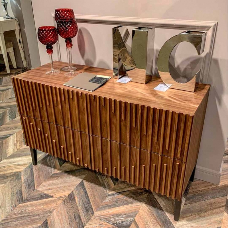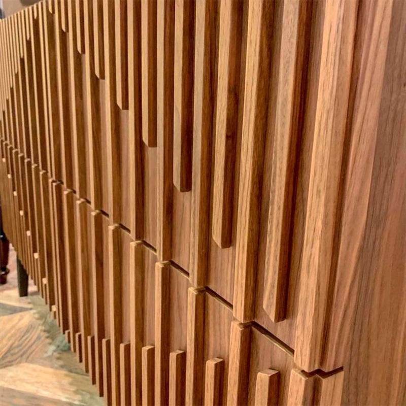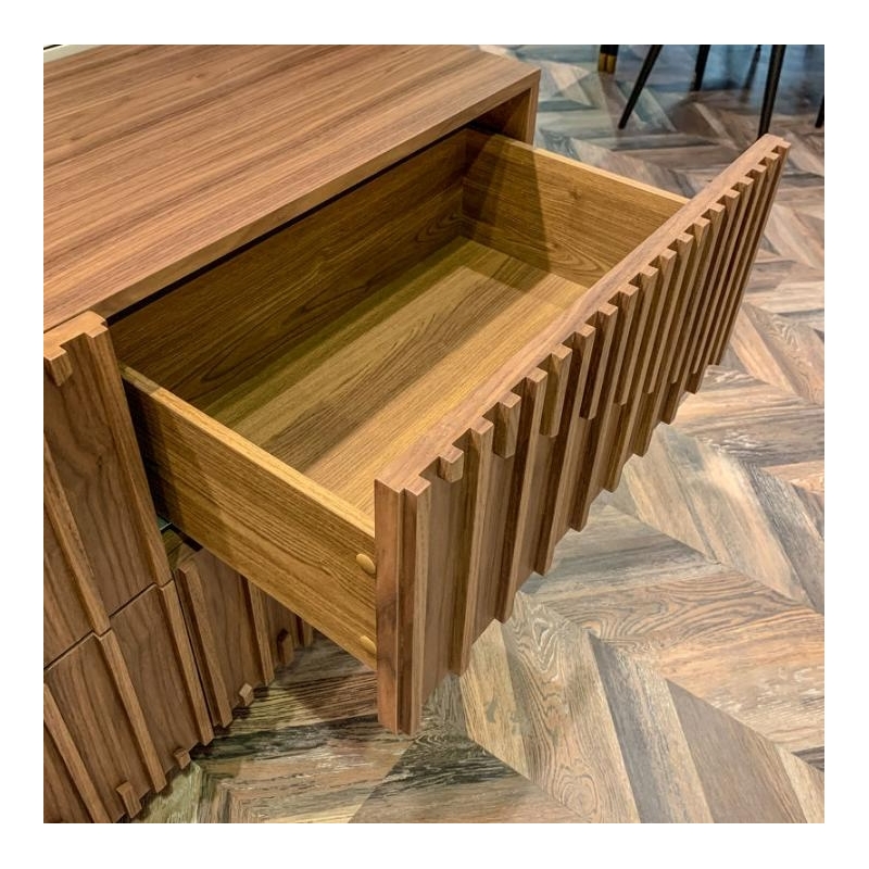 Фасады украшены симметричным реечным узором, придающим комоду выразительную текстуру и визуальную глубину. Корпус выполнен из высококачественного сертифицированного МДФ высокой прочности, обеспечивающего устойчивость конструкции. Отделка включает шпон ореха F (V36F) и матовый лак (P21), подчеркивающие натуральность материалов и премиальный характер мебели.
